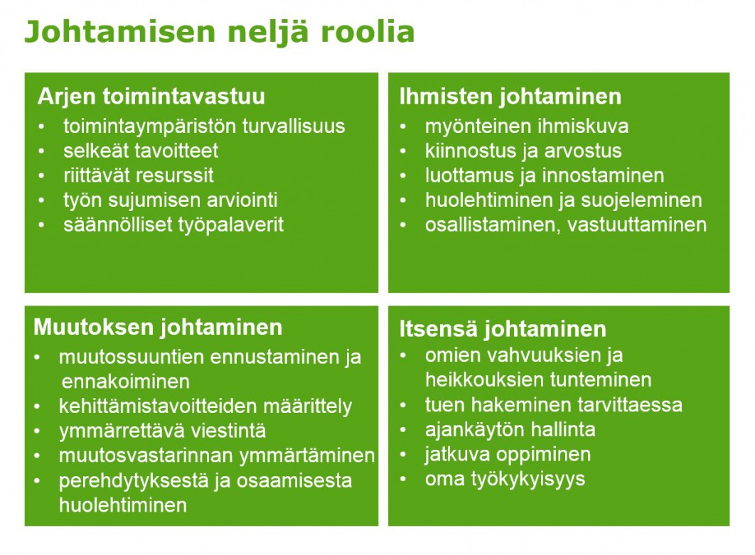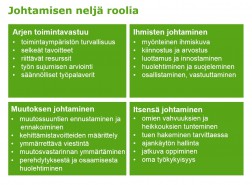 Esimiehellä on johtamisessa neljä tärkeää roolia. Miten aika näiden roolien toteuttamiseen jakaantuu? Klikkaa kuvaa suurentaaksesi!