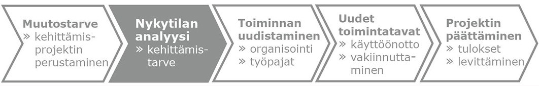 Työntekijöiden omat kokemukset ovat kehittämisprojektin tärkein lähdeaineisto. Niiden esille saamiseksi haastattelut ovat tehokas keino. Nykytilan selvittämiseksi voidaan haastattelun lisäksi tai sen tilallakin käyttää myös työpaikkatutkimuksia, kyselyjä ja mahdollisia aikaisempia kehittämistoimia.